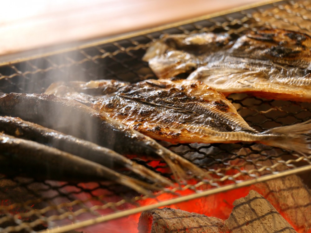 囲炉裏で炙った干物、素朴な田舎汁、季節の山の小鉢など。とてもシンプルですが、この季節ホッと温まる朝食となります。